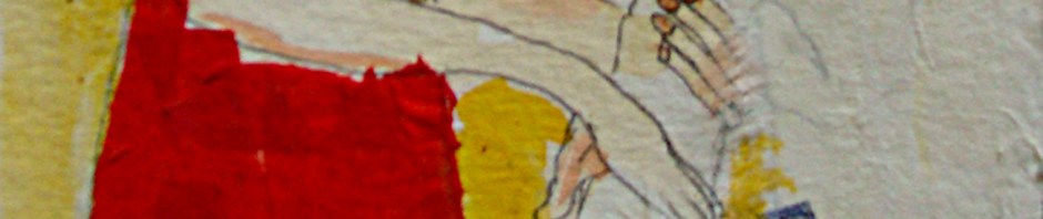 Guest Spot is delighted to present six watercolor-collages by Jamie Kelty, from the winter of 2010-2011. Here’s the good word from Ms. Kelty: “Looking at them now, I realize that I must have been searching for the sun. These characters seem to be in warmer climates. The bits of paraphernalia are collected from gift wrap, old dictionaries, ticket stubs, and magazine ads. I like to use these bits to imbue a sort of personality for the painted figures, and to add color and texture to the surface of the paper.”
