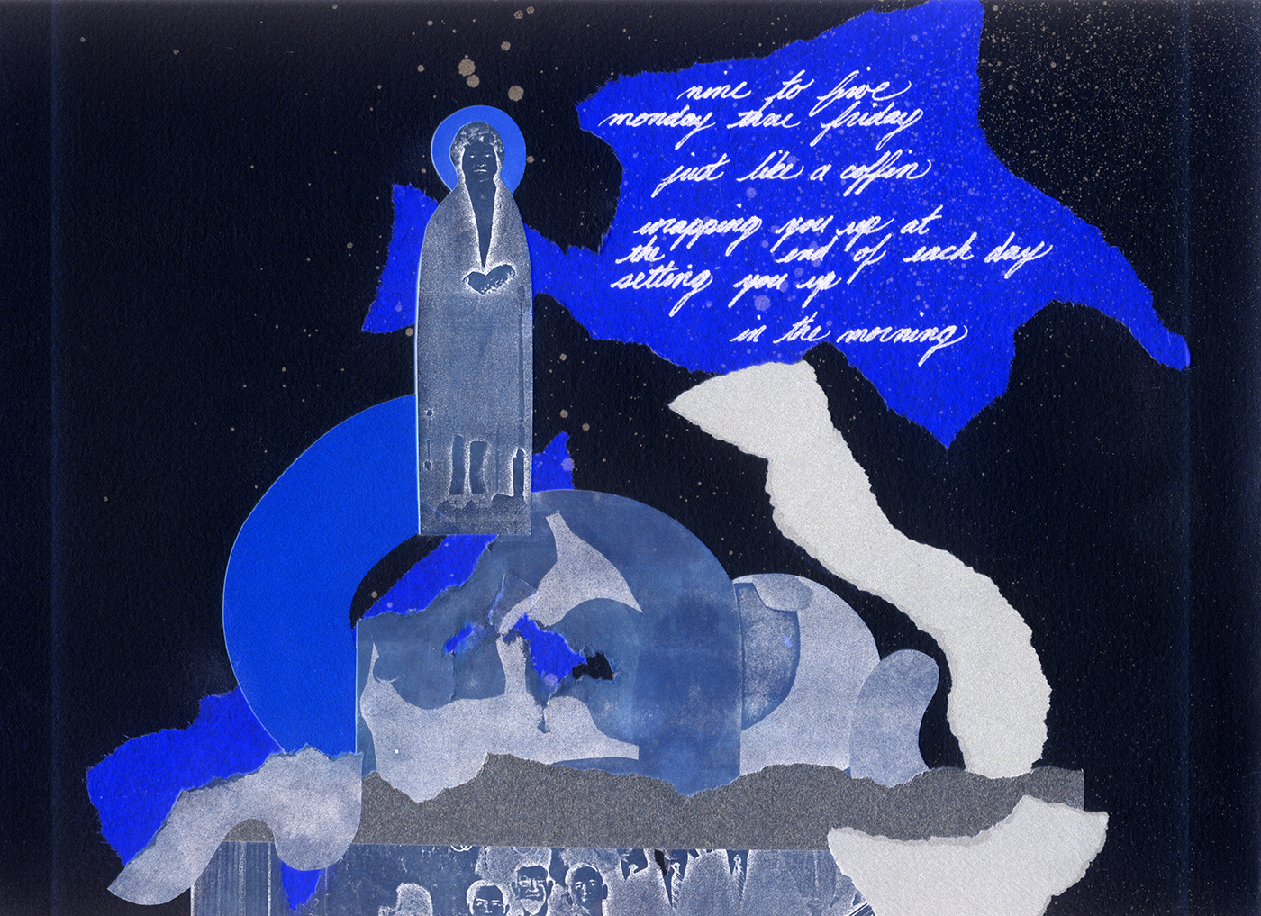 Three of the images coming up are from an angsty collage about office procedures. They feature a photocopied photograph of a board of directors, most likely taken in the early ’70s. No idea what the company was. There’s only one woman. She must have been tiny. She’s standing on a stair step. She’s the Patron Saint of Office Procedures and I both despise and adore her.