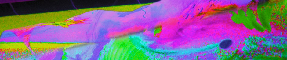 I have no idea how we decided to do this and am not sure when. But I do remember it was so much fun! Oil paint, spray paint, and oil pastels on canvas. All three of us working at once. Actual size: 45 inches high by 51 inches wide. Happily hanging on my bathroom wall, where it brightens my view every day. Thanks to Susan Scutti and Tom Burnett for (a) joining in creating the original art; and (b) saying yes to publishing the transformations. Rock on with all your socks on!