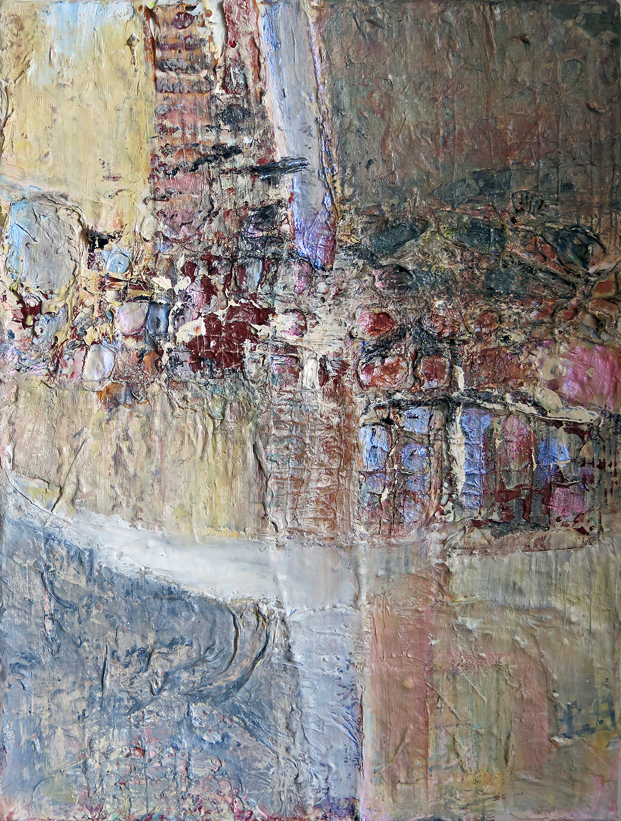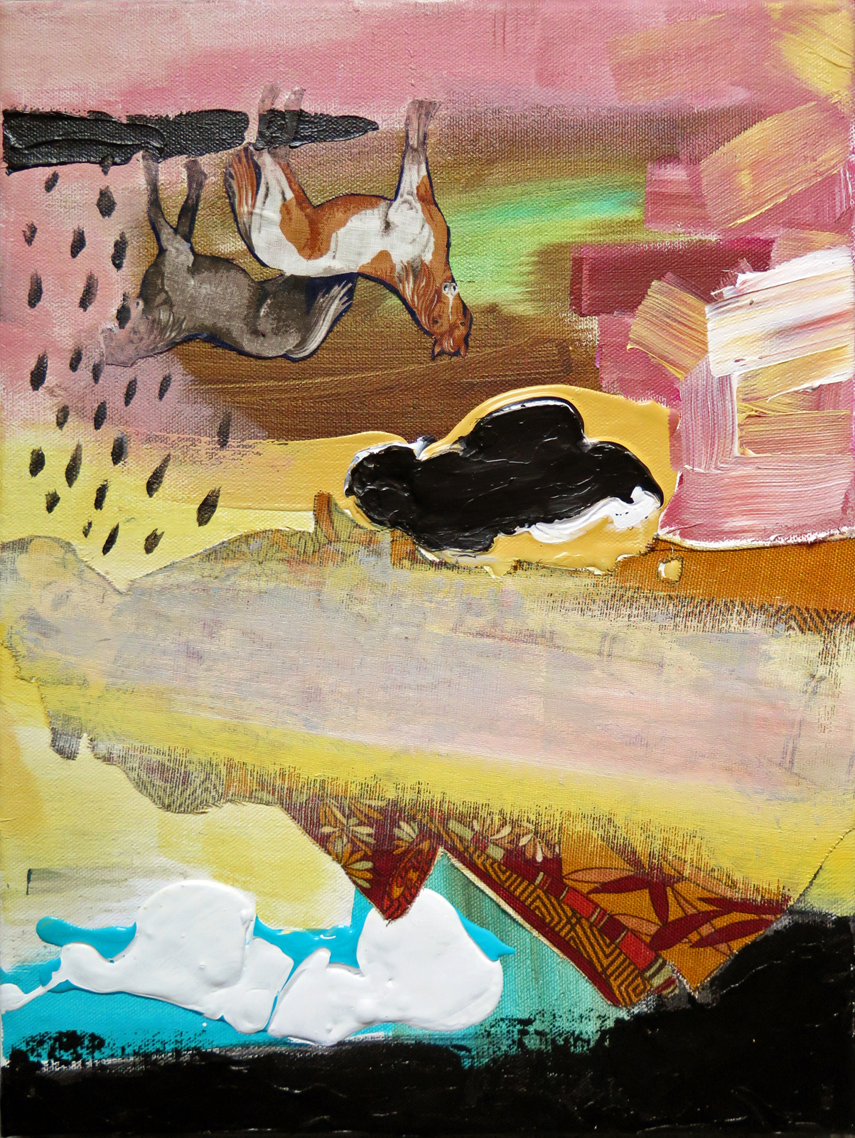 “Crossing,” acrylic, silk, modeling paste and paper on canvas, 12 x 9 inches, 2015