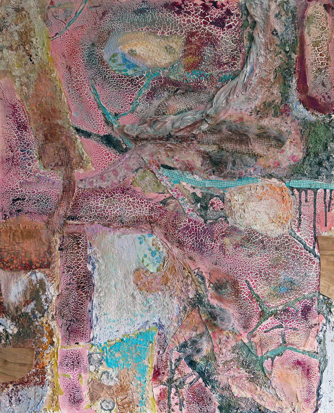 “Overland to the River,” acrylic, modeling paste, faux fur, cheesecloth, burlap, textiles, glitter and wood veneer paper on panel, 30 x 24 inches, 2016