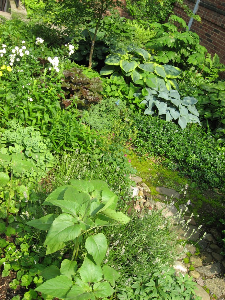 Smooshed up against one of the brick walls, I glimpsed a bit of green. Poked about and discovered it was the peppermint, still fully alive. After asking the landlord if it was OK to rebuild, I proceeded to dig out the entire plot with a spoon and hauled the debris away, rescuing what could be rescued and slowly evolving the mix to its current unbelievable lushness. June 2, 2012 – Life is amazing in all its permutations. Rock on.