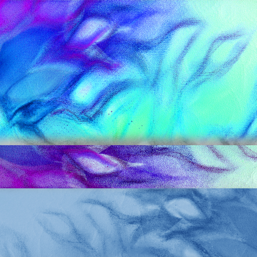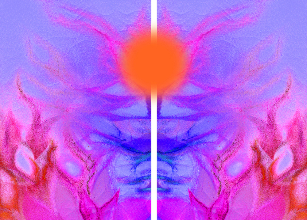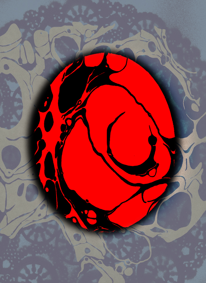 For many digital artists, a piece begins on the computer screen. This is not the case for Rutgers, whose original source is often a collage of paint and natural objects on canvas, which she then digitizes with image capture, or high-resolution scan. Both Saturated Bliss and Growing began with a 15 by 15-inch, mixed-media canvas featuring spray paint and ailanthus leaves, two significant motifs for the artist.